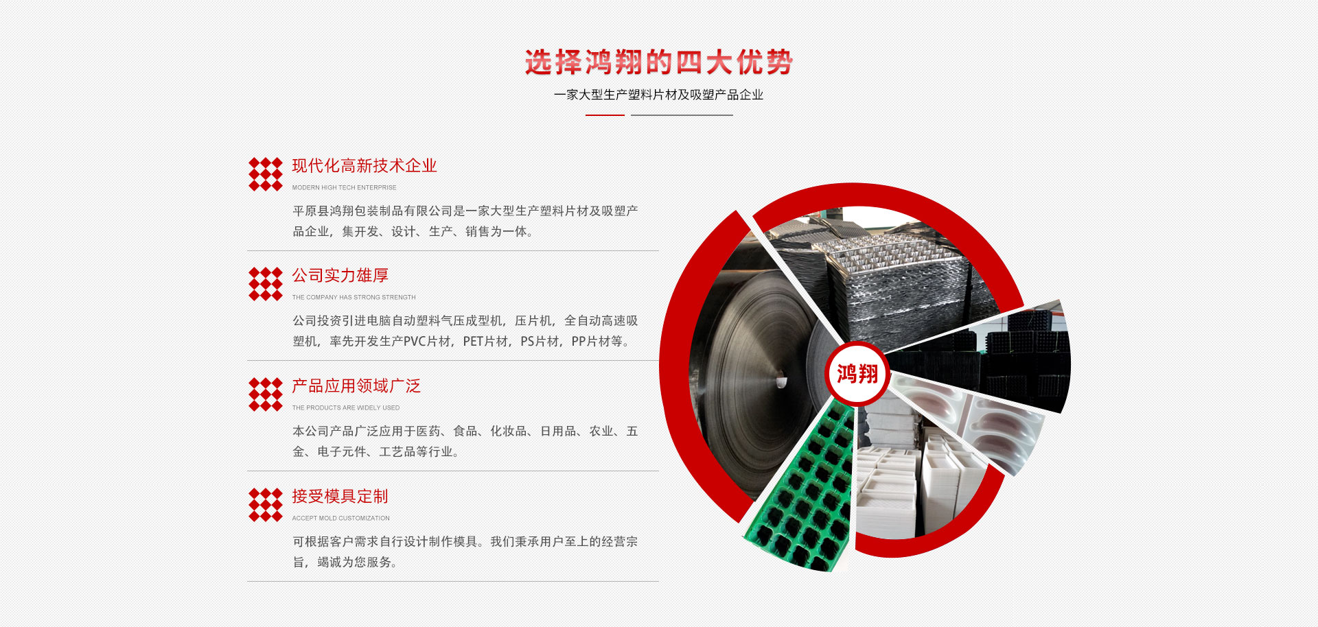平原縣鴻翔包裝制品有限公司是一家大型生產(chǎn)塑料片材及吸塑產(chǎn)品企業(yè),本公司投資引進(jìn)電腦自動塑料氣壓成型機(jī),壓片機(jī),全自動高速吸塑機(jī),率先開發(fā)生產(chǎn)PVC片材,PET片材,PS片材,PP片材等,鴻翔是國內(nèi)先進(jìn)的生產(chǎn)廠家之一。本公司產(chǎn)品廣泛應(yīng)用于醫(yī)藥、食品、化妝品、日用品、農(nóng)業(yè)、五金、電子元件、工藝品等行業(yè),也可根據(jù)客戶需求自行設(shè)計(jì)制作模具。本公司技術(shù)力量雄厚,生產(chǎn)設(shè)備工藝先進(jìn)。我們秉承用戶至上的經(jīng)營宗旨,竭誠為您服務(wù)。